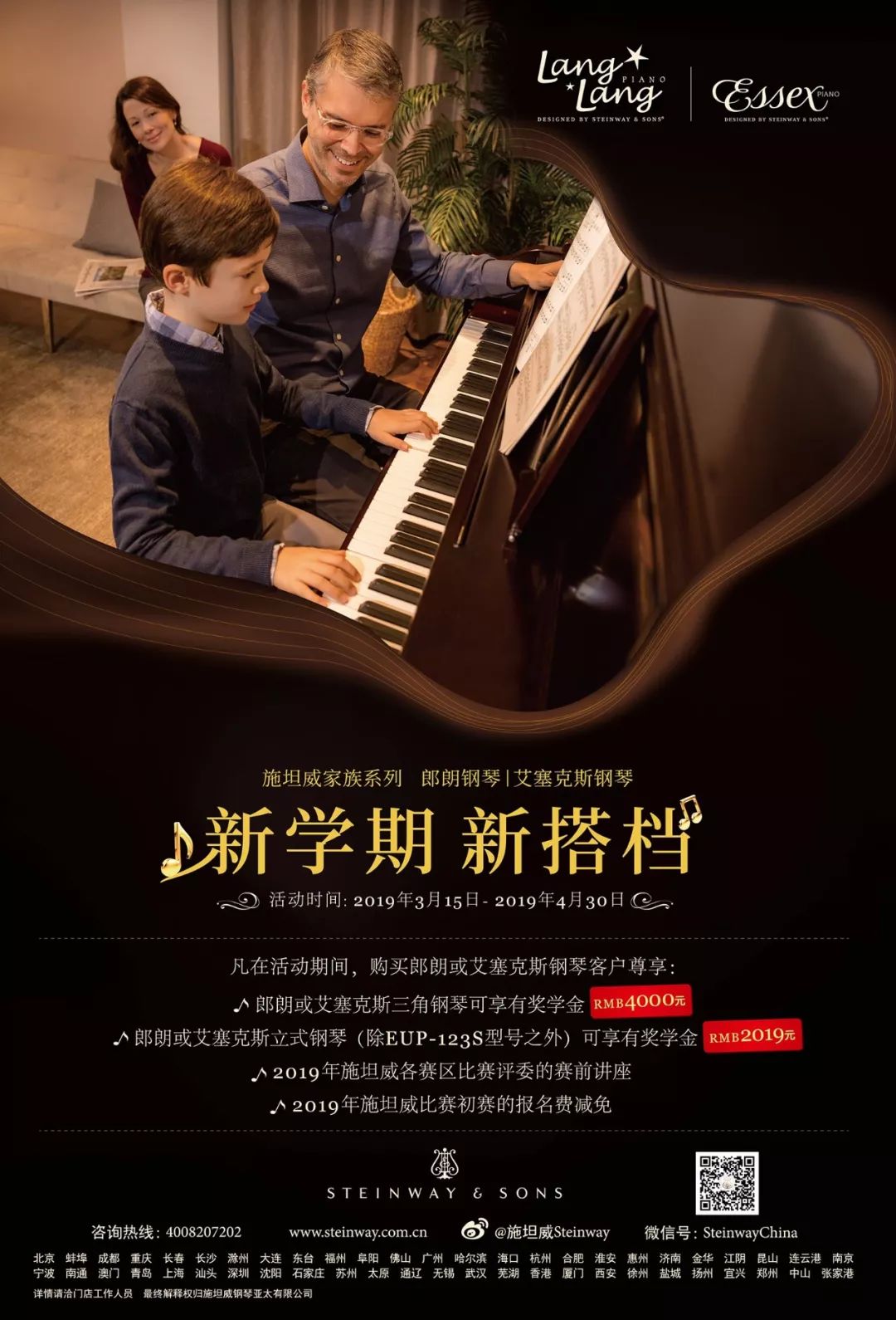 2. 活动期间购买郎朗或艾塞克斯立式钢琴(除EUP-123S型号之外)的私人客户即可享有奖学金人民币2,019元(贰仟零壹拾玖元整)/台。