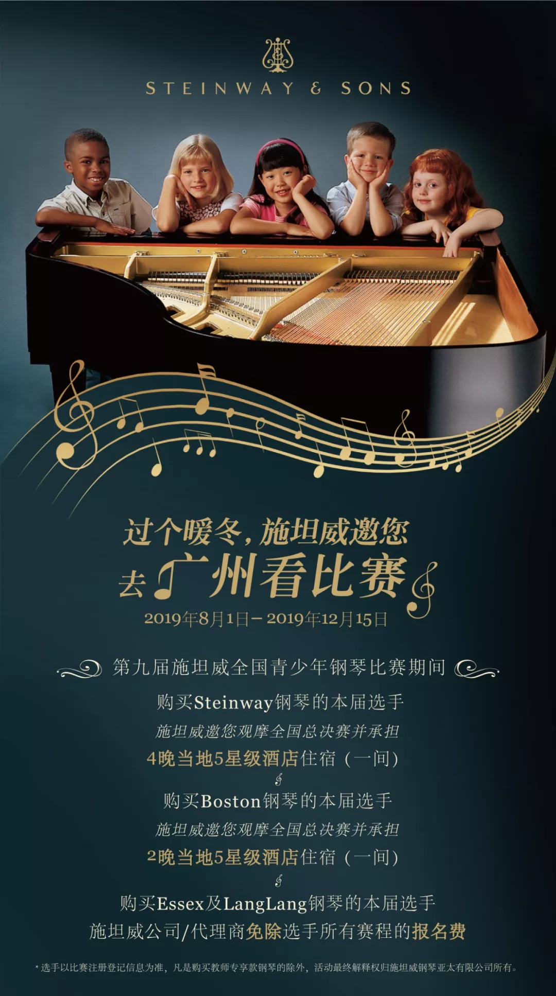 第九届施坦威全国青少年钢琴比赛总决赛将于12月13-15日在广州举行。在比赛期间(2019年8月1日-12月15日)购买施坦威及其家族产品的本届选手,施坦威将邀您观摩全国总决赛,并承担对应的酒店费用或免除选手所有赛程的报名费用。