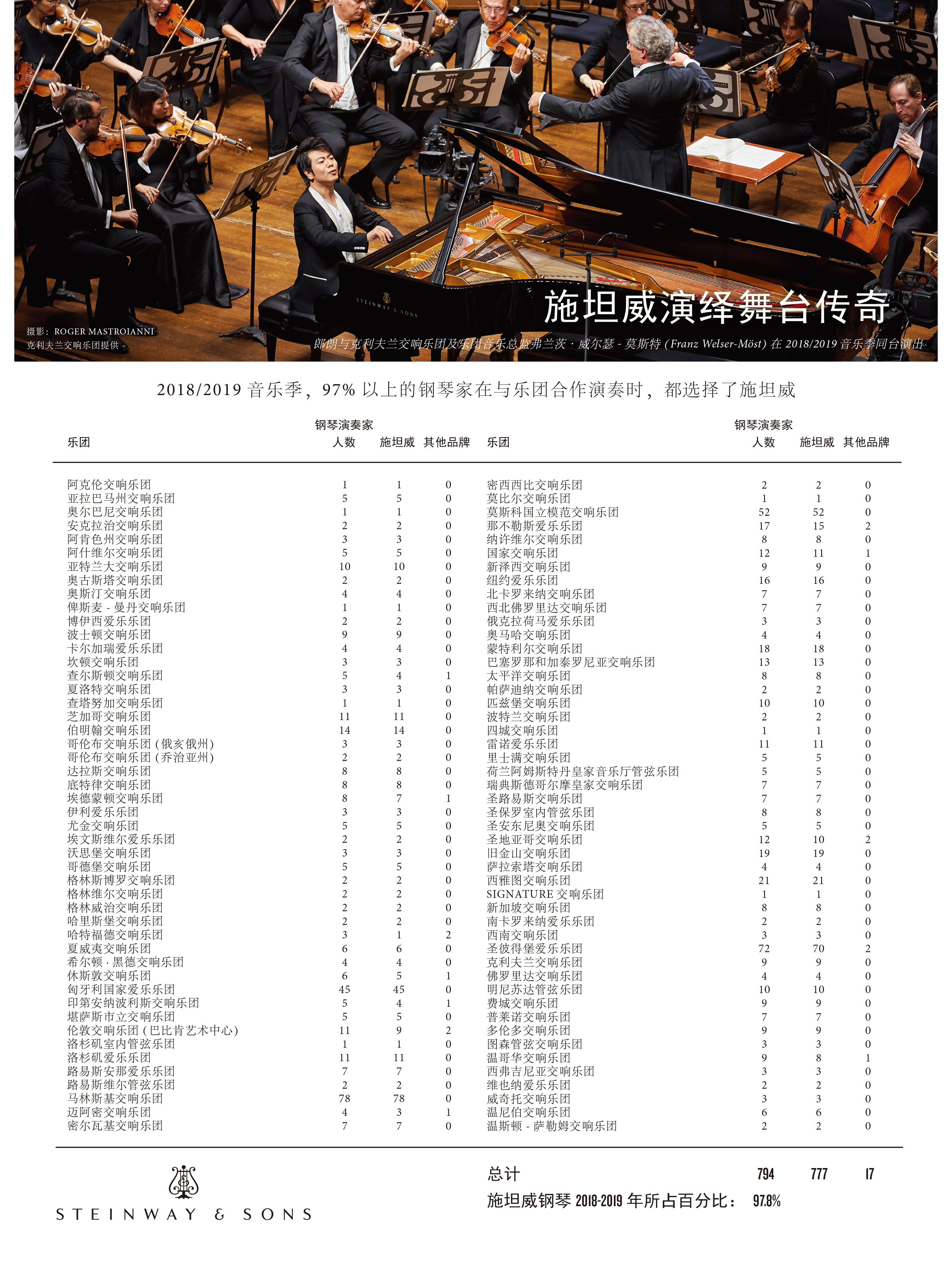 2018/2019音乐季,97.8%以上的钢琴独奏家都选择了施坦威钢琴进行演奏。