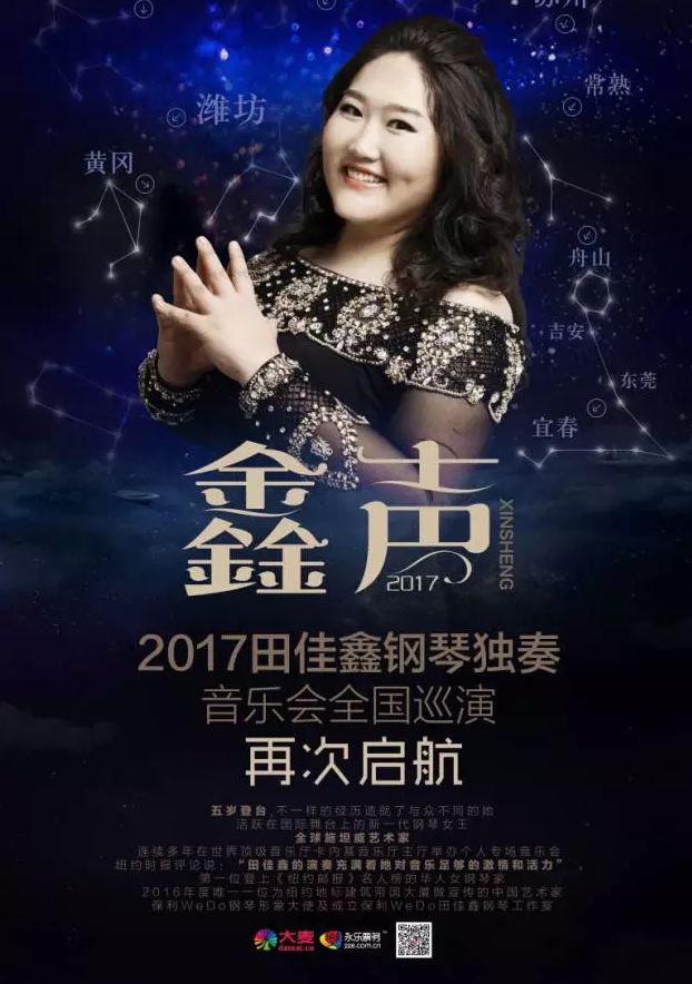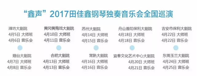 “鑫声”2017田佳鑫钢琴独奏音乐会全国巡演火热进行中,接下来田佳鑫会继续携手施坦威钢琴,走进苏州大剧院、常熟大剧院、舟山普陀保利大剧院、宜春文化艺术中心大剧院、吉安市保利大剧院,并在东莞玉兰大剧院画上完美的句号。期待佳鑫的精彩演出和倾情授课,也祝愿此次全国巡演圆满成功。