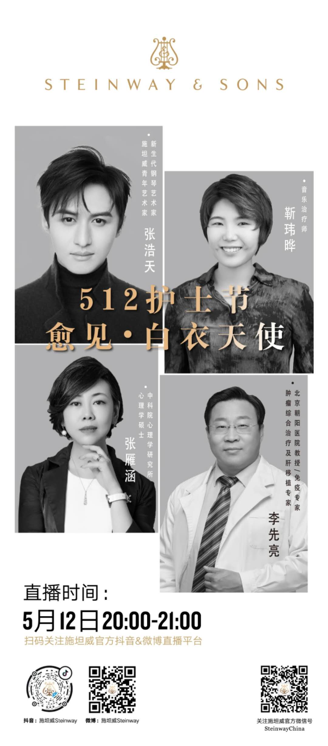音乐能抚慰人心,给人力量。今年年初,一场突如其来的疫情席卷而来,医护人员坚守岗位、敬业奉献,经历巨大的工作强度和精神压力,他们的心理健康也是我们非常关注的一部分。5月12日 ,正值护士节之际,新生代钢琴艺术家、施坦威青年艺术家张浩天与北京朝阳医院李先亮教授、中科院心理学研究所张雁涵老师、音乐治疗师靳玮晔将开启“愈见·白衣天使”主题直播,用音乐的治愈力量,向白衣天使致敬。