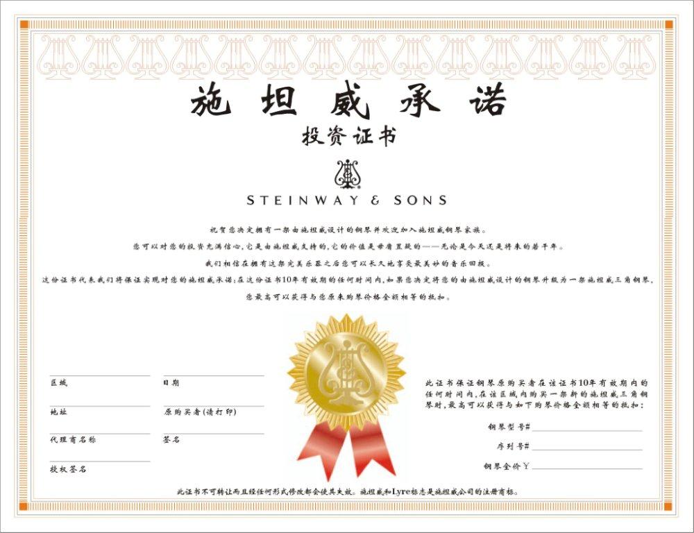 拥有一架施坦威钢琴的梦想并不遥远,可以从拥有一架郎朗钢琴开始。郎朗钢琴的设计初衷就是“成就明日之星”,随着演奏技巧的提升,您会发现您需要更高水准的钢琴。此时,施坦威钢琴将会是您理想的选择。这就是为什么施坦威对郎朗钢琴的购买者提供承诺:如果在十年内,您打算将您的郎朗钢琴升级为一台全新的施坦威三角钢琴,您最高可以将该郎朗钢琴当初购买的原价进行抵扣。