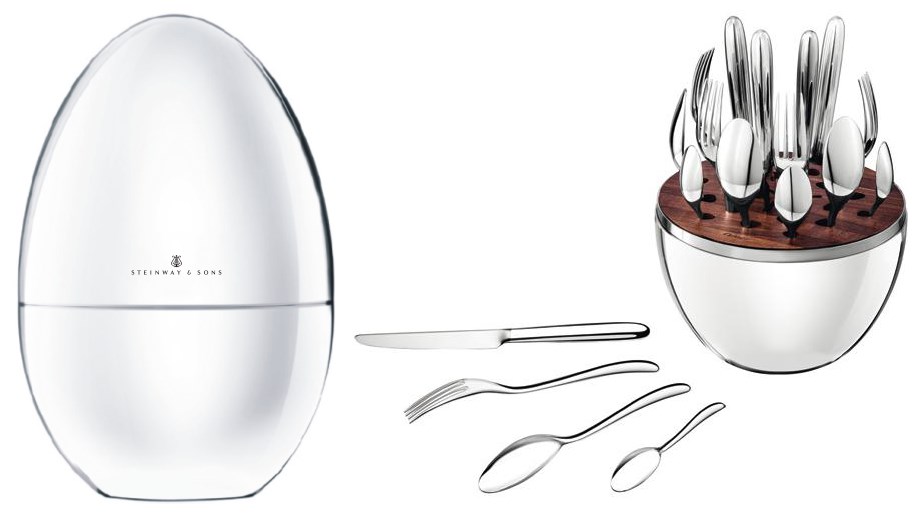 赠品施坦威Christofle合作款银蛋为一套24件供6人使用的银制餐具,其中包括6件主餐刀,6件主餐叉,6件主餐勺和6件咖啡/茶勺。Chistofle品牌于1830成立于法国巴黎,为皇室御用金银器供应商。施坦威定制银蛋在保持Christofle一贯的极高的工艺水准同时,别开生面地采用椭圆球体作为容器,不仅能更好的防尘收纳,也为厨房和家居生活增加了趣味而优雅的摩登艺术气息。