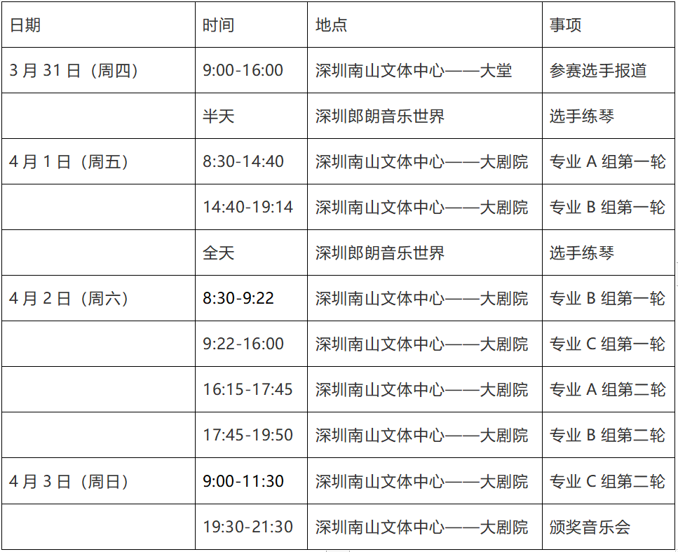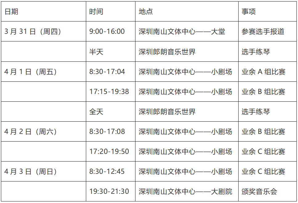 3.组委会严格执行练琴与比赛安排,请各选手与家长认真计划在深圳的出行安排,按规定时间准时抵达练琴与比赛场馆。深圳交通情况复杂,上下班高峰时间较其他时间更为拥堵,请各位家长及选手务必预留足够的时间,以保持良好的状态。