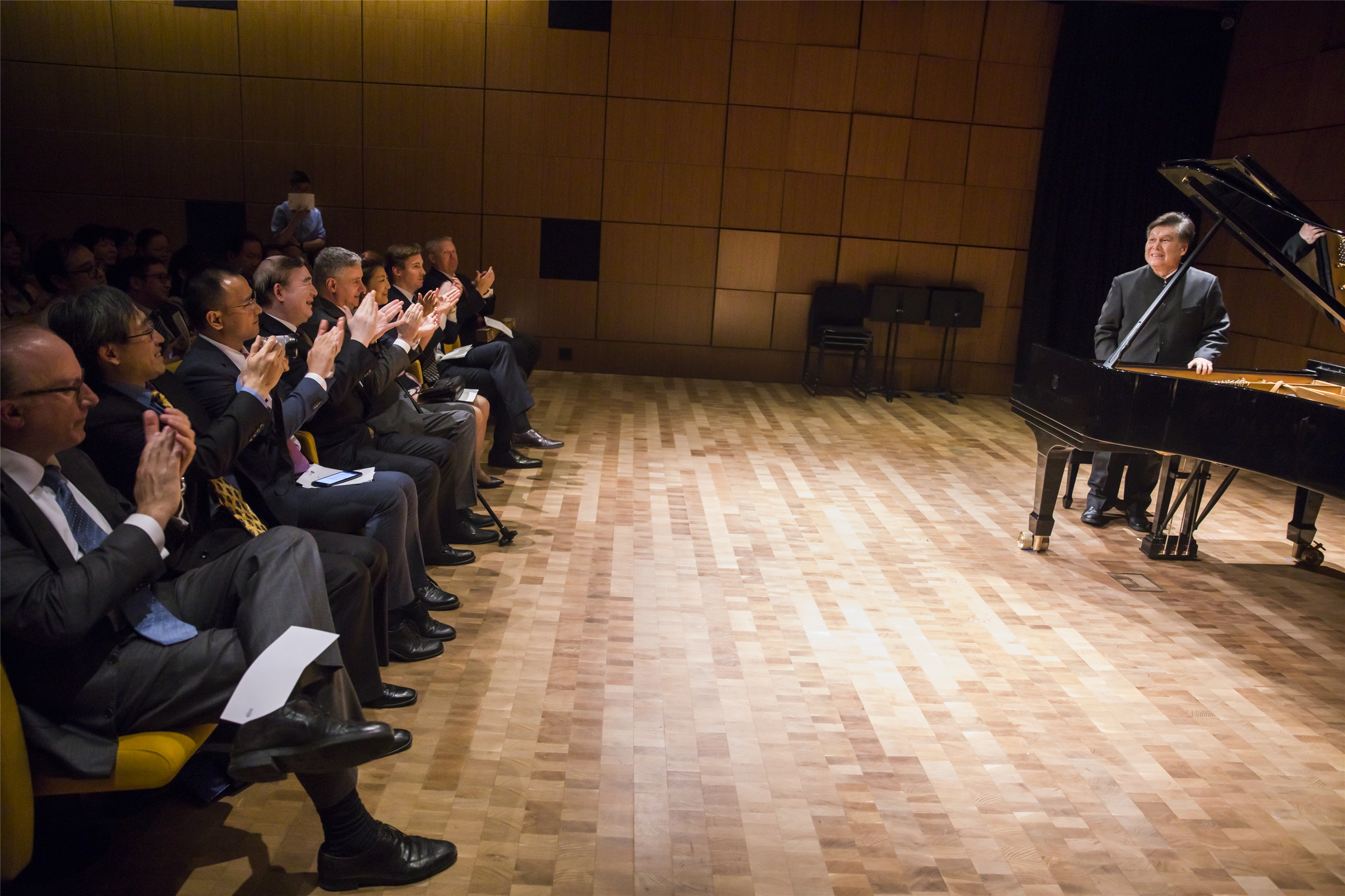 施坦威钢琴首席行政官罗恩·罗斯彼(Ron Losby)先生(左六)、施坦威全球首席财务官及运营官本杰明•斯坦纳(Benjamin Steiner)先生(左四)、中央音乐学院院长俞峰先生(右五)等与艺术家合影