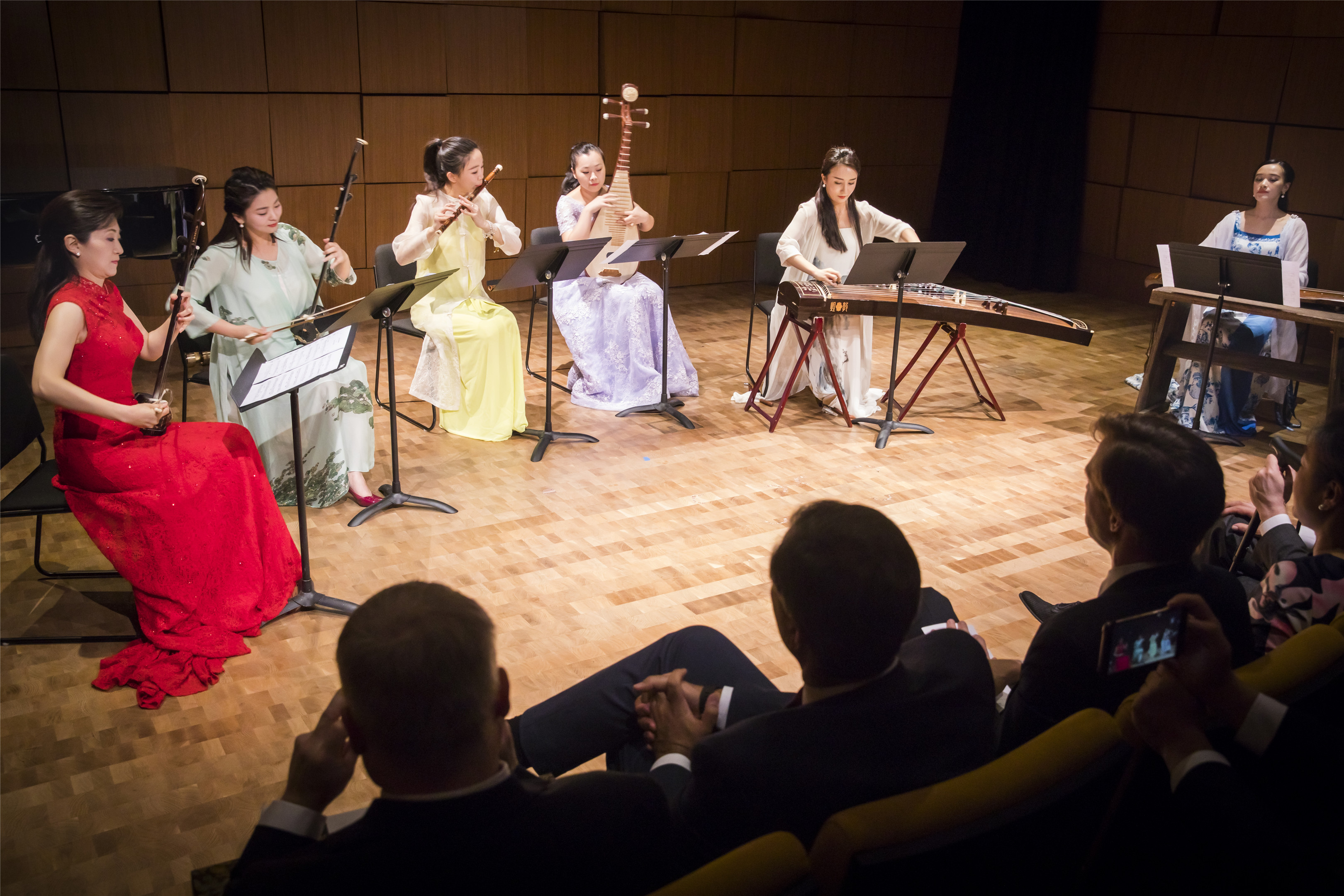 该教学点将用于教授中国民族音乐和乐器,并展示具有中国文化底蕴的乐器藏品和艺术品。中央音乐学院院长俞峰先生一直致力于与施坦威建立积极有效的合作伙伴关系,共同推动中国民族与当代音乐在美国的传授推广。揭幕仪式上,施坦威公司亦对他的不懈努力与付出表达了由衷的敬意。来自中央音乐学院民乐系的顶级民乐艺术家于红梅、赵晓霞、刘小菁、程皓如、冯天石、闫国威先后在音乐会上用琵琶、古筝、箫、古琴、高胡、中胡、二胡以及竹笛演奏了多首中国经典民乐曲目。随后,施坦威艺术家、中央音乐学院校友殷承宗先生应邀为当晚庆祝音乐会演奏了多首舒伯特的作品以及他本人和黎瀛海编曲的《春江花月夜》,他的精湛技艺赢得了来宾们的热烈掌声。