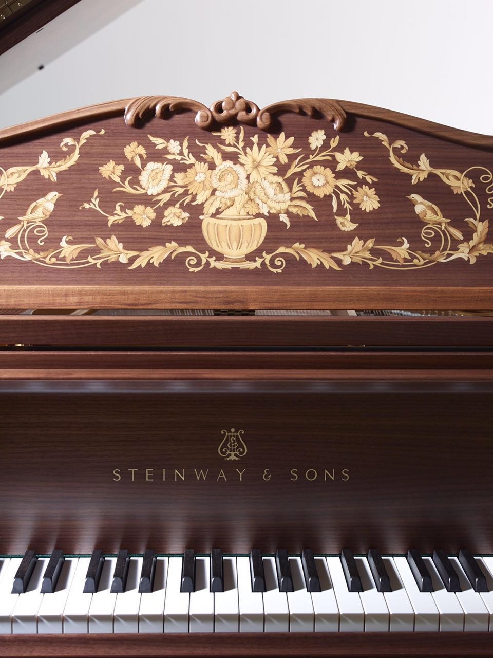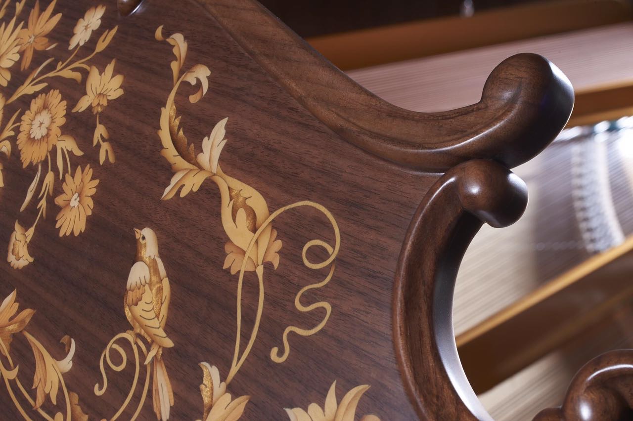 这款“施坦威·花语”高端定制系列特别版钢琴有着路易十五的家居风格,并配有手工镶嵌的精美图案。她有O180及B211两个型号,并配有桃花心木和胡桃木两种饰面可供选择。
