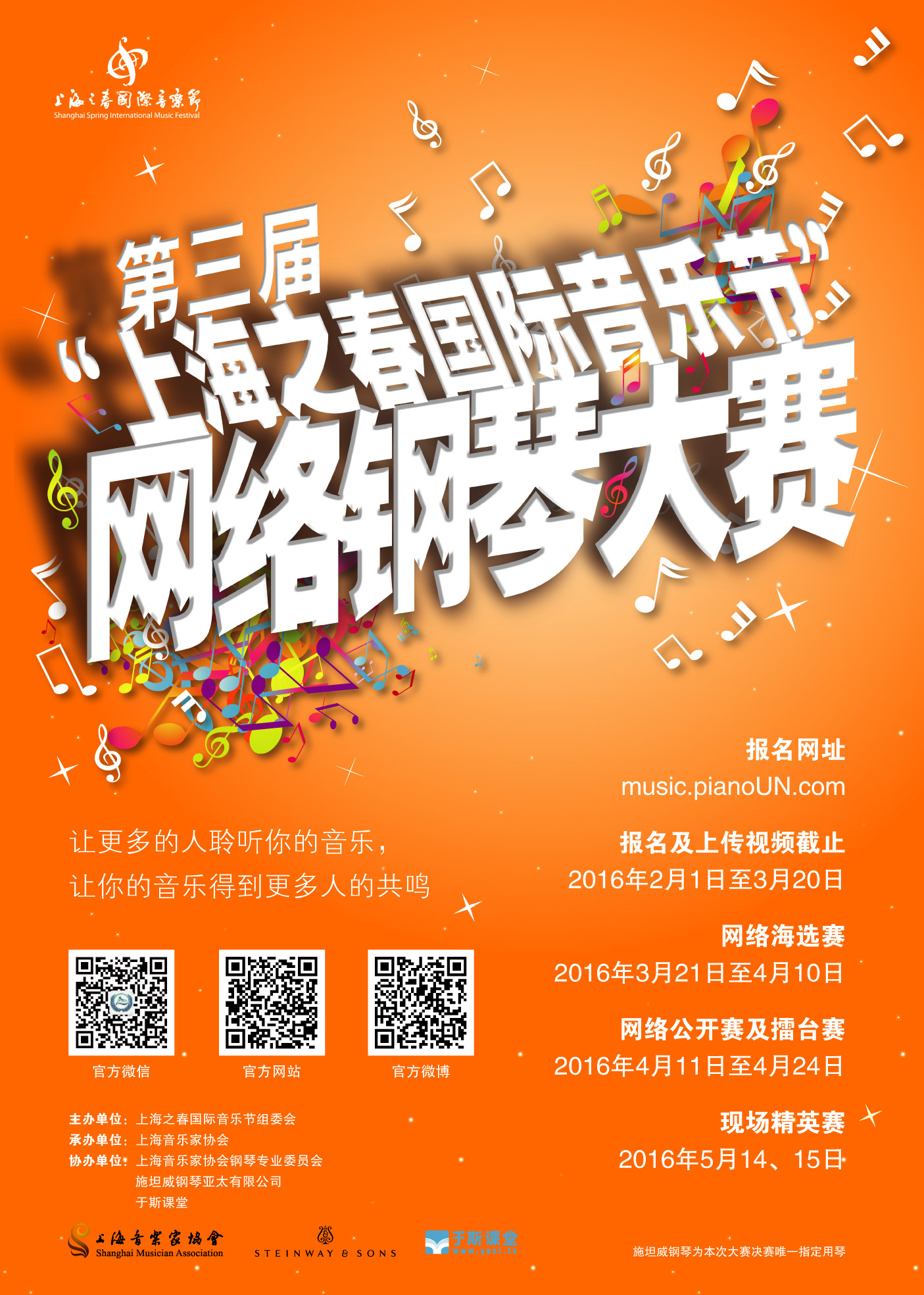 第三届“上海之春国际音乐节”网络钢琴大赛将于2016年2月--5月再次举办。本次大赛由上海之春国际音乐节组委会主办,上海音乐家协会承办,上海音乐家协会钢琴专业委员会、施坦威钢琴亚太有限公司及于斯课堂协办。施坦威钢琴亚太有限公司以及官方授权代理商(含中国大陆及港澳台, 印尼,马来西亚)全程全力支持本次比赛,在亚太各地施坦威门店为选手免费提供钢琴录制参赛曲目。本次大赛将继续沿承互联网+传统钢琴比赛的形式以及专业性、创新性、全球性的办赛特色,同时辅以专业权威的强大国际评委阵容,更新形式、更广范围、更大程度、更具影响力地展示全球华人钢琴艺术成果,对中国乃至全球的钢琴艺术的发展起到强大的创新和推动作用!
