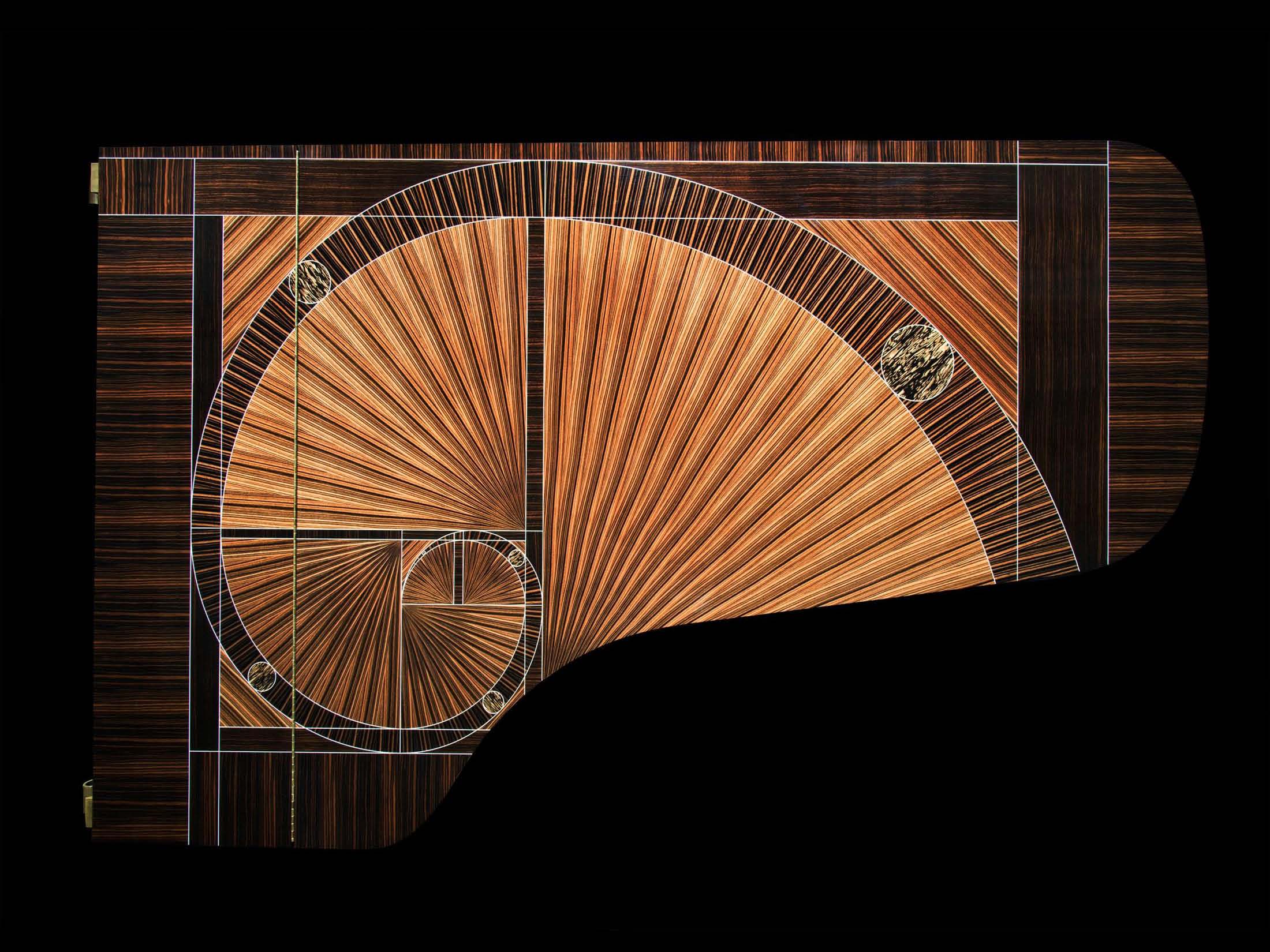Frank Pollaro说:“设计第60万架施坦威钢琴对我而言,既是荣誉又是挑战。得知这架钢琴将成为历史的一部分,我明白它需要的不仅是美观的设计,更需要从视觉上传递更深层次的信息。”Pollaro补充道:“当我在考虑数字600,000时,斐波纳契螺线跳入我的脑海。它不断生长,却始终与最初的形状始终保持,这像极了施坦威。音乐的语言与数学的语言就这样完美的融合在一起了。”